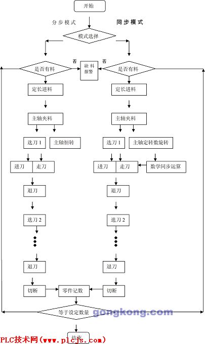 概述: JSD210K-N是用在小型圆柱形零件成批的大量生产中的一种半自动车床,该车床有自动定长进料、车削速度可调、自动按照预先设定的工序进行车削加工、零件计数等功能,完全去掉了老型号车床中的机械凸轮机构,减少了车床运行时的机械噪声,延长了车床的使用寿命,使车床的使用和维护都变得非常方便。 硬件构成: 该车床要求有自动定长进料、自动断料、可装夹三把车削刀具(三把刀按照预先设定的工序依次使用)、自动进刀等功能。 1、伺服驱动:主轴5.5KW,进料0.75KW,进刀0.5KW,走刀0.5KW共四套伺服系统,伺服系统选用安川的伺服放大器和伺服电机,转速最高为3000r/min,自带2000线的编码器和速比为50:1的二级减速机(主轴为自制减速机,分为四个速比,由PLC控制气缸动作进行档位切换,速比为2.5:1、10:1、60:1和300:1) 2、系统中有四个编码器信号需要采集,同时还有四路脉冲调制信号输出,故在系统中选用了2只S7-226CN的PLC,2只PLC通过PPI方式组成一个网络。一块存储卡,用于保存配方。 3、显示屏选用K-TP178micro触摸屏,通过PPI网络与S7-200CN的PLC进行数据交换。 ![]() 系统结构示意图 软件构成: 系统分两种操作模式:一种为分步操作,另一种为同步操作. ![]() 分步操作原理: 在K-TP178micro触摸屏上设定主轴转速,为保证主轴有足够的扭矩,程序会选择主轴齿轮箱采用合适的档位(两个数字量输出点驱动两只气缸动作),以保证电机能在1800r/min_2500 r/min之间运行.驱动器通过电机的编码器反馈构成闭环控制,以提高运行精度.速度给定由PLC输出端口的PTO脉冲调制来驱动,同时编码器信号由PLC的高速记数端口采集,用于实际速度的显示和在同步模式中的速度计算. 运行时,主轴会按照一个恒定的转速运行,可在K-TP178micro中设定刀具运行的进刀速度,进给量,及刀具的进刀次数. 同步操作原理: 运行模型 ![]() 软件构成: 1、把凸轮旋转一周360度分成24等份,平均每等份15度。运行时,利用CPU226CN的配方功能,把凸轮的运行速度和圈数用编码器脉冲数的形式存入配方中,同时输入对应的系数,选择主轴齿轮箱的速比。 2、把从轴(走刀和进刀)对应于主轴相对位置的旋转量用编码器脉冲数的形式也存入配方中,同时输入对应的系数,齿轮箱速比为50:1。 3、开机后,程序先把主轴、走刀和进刀,三个运行配方调入V存储区,乘上他们各自的系数和速比后进行对比,结果分别送入三个驱动器速度给定的脉冲调制PTO区。 4、一次走刀和进刀周期结束后,进入第二个循环周期,再次按三个运行配方中的第2条配方,把对应数值送入V存储区,重复步骤3的内容。在程序中共可设定60条配方条目。 5、运行完所有的配方条目,把零件从棒料上切断,同是程序计数,进料驱动器运行,进入下一个零件的加工周期。如无料或数量达到,停机。 ![]() 配方构成 ![]() 主程序构成 结束语: 新型号的S7-200CN PLC,指示执行速度更快,内存更大,增加了配方的功能,完全能够胜任车床对PLC的要求,也因为采用了S7-200CN的PLC,使车床加工零件的品种更多,更换程序更容易,也使对车床开发变得更加简单,更新速度更快.实际使用中,可以达到0.005mm精度,基本满足产品精度的要求. |