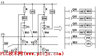 矩阵二极管顺序控制电路是原床电气系统中的重要组成部分,PLC梯形图的转换原理,如图4示。其动作如下: