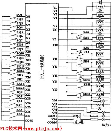 任何一种继电器系统都有三个部分组成,即输入部分,逻辑部分和输出部分。系统输入部分由所有行程开关、仪表触点、方式选择开关、控制按钮等组成。逻辑部分是指由各种继电器及其触点组成的实现一定逻辑功能的控制线路,输出部分包括电磁阀线圈,指示灯和接通各种负载的接触器线圈。在控制系统中使用PLC 就是代替继电器控制系统中的逻辑线路部分。原MZ2015磨床的电气系统,所有行程开关(SQ1~SQ17),选择开关(SA3),仪表触点(KA1~KA4),控制按钮(SB2,SB5)等为系统的输入信号;而电磁阀线圈(YV1~YV13),指示灯,充磁信号等为系统的输出信号。系统的硬件构成如图1所示,为了节省输出点数,各电磁阀的状态指示灯并联在其线圈两端;系统的调整操作采用由PLC的Y1和Y2输出调整信号在外部经相应开关控制。同时为了保护PLC输出继电器,在电磁阀两端各并联一只二极管,防止在电感性负载断开时产生很高的感应电动势或浪涌电流对PLC输出点及内部电源的冲击,二极管的额定电流通常选为1A,额定电压大于电源电压的3倍。