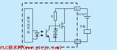 工作原理:若用户程序将输出置为“ON”状态,则在刷新输出阶段CPU将“ON”信号送给输出锁存器,再经过光电耦合送给场效应管,使之饱和导通,此时输出指示灯亮,且通过场效应管将DC24V和负载连通,从而使得负载获得工作电流。反之,若用户程序将输出置为“OFF”状态,则输出指示灯不亮,情况与上述相反。