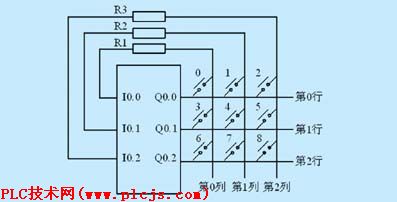 由以上分析可知:PLC的I/O口内部电路与一般的计算机系统(如单片机系统)有较大的不同,这就决定了在PLC系统中设计矩阵式键盘也有其特殊性。首先,由于输入模块中有RC滤波电路,其滤波延迟时间可以通过编程软件设置,即其本身存在硬件消抖动的功能,因此不再需要软件延时消抖动;其次,由于用到了PLC的输出口,它本身可以输出对M端有DC24V的电压,因此不再需要外接电源;最后,由于PLC的输入口有6K左右的输入电阻,因此可以将DC24V的电压直接加上,若为了延长I/O口的使用寿命,一般按照输入模块的技术指标来配置限流电阻,经查阅输入电流的典型值为4mA,一般取R1=R2=R3=0.5K即可。如图4所示为3行3列矩阵式键盘的结构图。