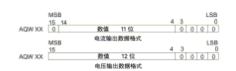 输出拟量在程序中的寄存器,离CPU模块由近到远依次AQW0、AQW2、AQW4……, 每个通道是两个字节,数值特性与上类同。
