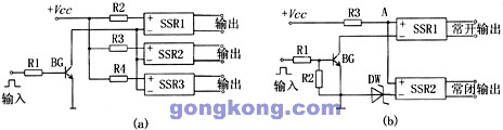 通常SSR均设计为“常开”状态,即无控制信号输入时,输出端是开路的,但在自动化控制设备中经常需要“常闭”式的SSR,这时可在输入端外接一组简单的电路,如图5c所示,这时即为常闭式SSR。 2、多功能控制电路 图6a为多组输出电路,当输入为“0”时,三极管BG截止,SSR1、SSR2、SSR3的输入端无输入电压,各自的输出端断开;当输入为“1”时,三极管BG导通,SSR1、SSR2、SSR3的输入端有输入电压,各自的输出端接通,因而达到了由一个输入端口控制多个输出端“通”、“断”的目的。 图6b为单刀双掷控制电路,当输入为“0”时,三极管BG截止,SSR1输入端无输入电压,输出端断开,此时A点电压加到SSR2的输入端上(UA- UDW应使SSR2输出端可靠接通),SSR2的输出端接通;当输入为“1”时,三极管BG导通,SSR1输入端有输入电压,输出端接通,此时A点虽有电压,但UA-UDW的电压值已不能使SSR2的输出端接通而处于断开状态,因而达到了“单刀双掷控制电路”的功能(注意:选择稳压二极管DW的稳压值时,应保证在导通的SSR1“+”端的电压不会使SSR2导通,同时又要兼顾到SSR1截止时期“+”端的电压能使SSR2导通)。