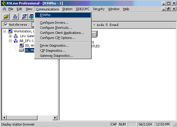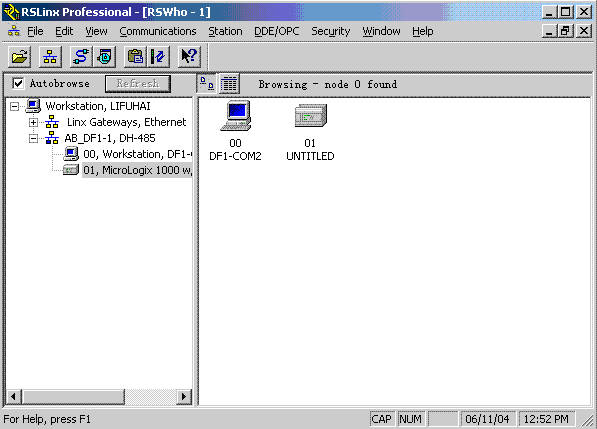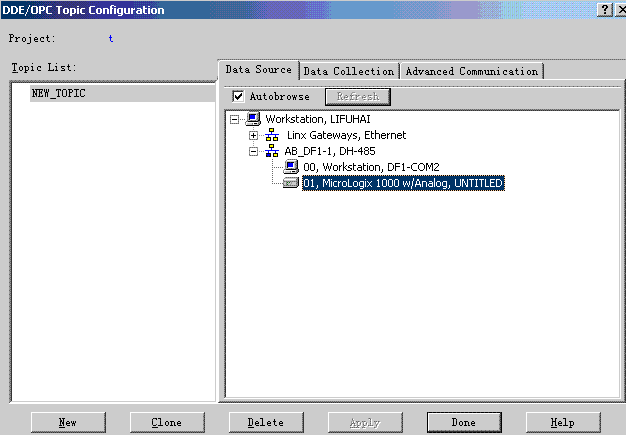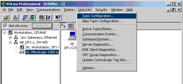 Rockwell Automation 的A-B PLC是一个著名的可编程控制器产品。其产品体系基本上涵盖了工业控制产品的各个领域,由于A-B的PLC的种类繁多,且各种类型的PLC支持的通信协议不尽相同,使得第三方的HMI软件都不能很好的与A-B PLC进行连接。RSLinx软件是A-B PLC通用的通信配置软件(2.2以上的版本支持对以太网的网关配置),目前主要有以下几个版本:RSLinx OEM、 RSLinx Professional 、RSLinx Gateway、 RSLinx SDK四个版本。且均支持OPC服务(2.3版以上支持OPC2.0版)。 多数上位机软件已内嵌了OPC服务功能,支持OPC客户端和OPC服务器的工作方式。这样就可以很方便的与A-B PLC进行通信。具体的配置方法如下: 与A-B PLC进行OPC的配置是必须要有A-B PLC及相关的通讯附件。 1、 安装A-B PLC 、通讯卡、相关的软件,并作物理连接 2、 使用RSLinx连接A-B PLC的通讯网络。 配置通讯卡(参加图-1),选择ConFigure Drivers。 图-1 弹出入下的配置窗口(参见图-2)。 图-2 选择对应的通讯卡,并进行端口配置(可参照附带的安装手册),配置成功后将显示所配置的设备的运行状态。 使用RSWho命令查找连接的PLC设备(参见图-3)。 参见图-3 RSWho命令成功的执行后,将在设备列表中列出与本机连接的所有硬设备(参见图-4)。 图-4 使用Topic Configoration来进行OPC服务的配置(参见图-5)。 图-5 在Date Source配置框中配置Topic,选择一个物理设备(PLC),按New按钮即可建立一个Topic,在DATA SOURCE中选中你所要连接的物理设备,选中后,单击Done即可(参见图-6)。