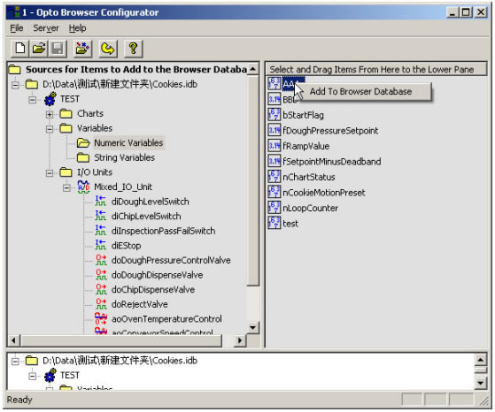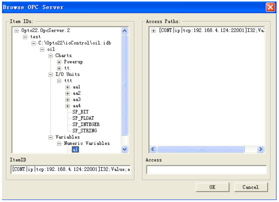 Ifix没有Ultimate的驱动,因此其和OPTO 22设备的连接需要通过OPC或者DDE来进行连接,此文章主要是对OPC连接方法进行说明。 Ultimate IO系统首先要安装其5.0版本,必须要Ultimate IO和OPCServer两个。否则在Opto Browser Configurator中进行OPC数据源配置时将无法彻底完成 Ifix2.6提供OPC Server和OPC Client组件,两个组件用户可任意安装其中的一个,在Ifix2.6的OPC Server组件中包含了OPC Client。安装完毕后启动ifix然后加载OPC Client接口。 1、 Opto22侧配置过程 我们首先进行ioctrl的配置,做好工程方案,然后下载到Ultimate IO中。 启动OPC Server Browser Configurator,然后选择工程方案,此时会在目录树中显示如下图 ![]() 然后再页面的右边击右键,可以把变量和CHART、IO状态添加到数据库中,然后点击Server菜单,Update Server with ……..,然后关闭配置界面。 进行完以上配置后, OptoOPCServery已经开始运行。 以上主要是进行了Ultimate IO的配置,配置完成后需要在Ifix2.6软件上作配置。 2、 Ifix2.6侧配置过程 在安装完毕Ifix2.6自带的OPC Client后,需要在Ifix中的系统配置项进行OPC接口加载。启动Ifix2.6后进入系统配置窗口,如下: ![]() 加载OPC 接口 后,在ifix开发状态下启动OPC Client进行OPC配置。配置画面如下: ![]() 点击连接后进入OPC Client 进行数据配置 ![]() 在OPC Item Settings中的Item项的配置可以通过点击Browse Server按钮进行添加和修改,在添加和修改工作进行前,必须先取消画面上的Enable选项。 ![]() 点击确定后,完成了一个Item的配置,然后根据需要可以配置其它所有需要和ifix2.6交换数据的Item项。 完成所有OPC配置后,在Ifix2.6的实时数据库中进行配置,完成Opto22 Ultimate I/O到Ifix2.6数据库的整个数据链路配置。 在整个OPC配置过程中,用户只需要通过鼠标点击就能完成所有的配置工作,在图形界面的帮助下,用户可以无须了解OPC Item的烦琐定义规范,能极大的提高配置的效率和准确性。 | |
