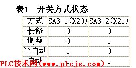 原机床包括自动、半自动、调整和长期修整4种工作方式,由万能转换开关选择。用PLC改造后,此部分的接线要重新安排,可选用转换开关的两组触点SA3-1和SA3-2(对应PLC输入端子X20和X21),使其分别在4种工作情况下,满足表1所示的通断状态。
