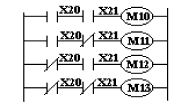 表1中“0”表示断开,“1”表示接通。如用二进制表示X20 和X21 的状态,即为00,01,10和11四种。如图2示,自动方式时驱动M10,半自动时驱动M11,调整时驱动M12,长修时驱动M13。这样可安排出图3的程序结构图。