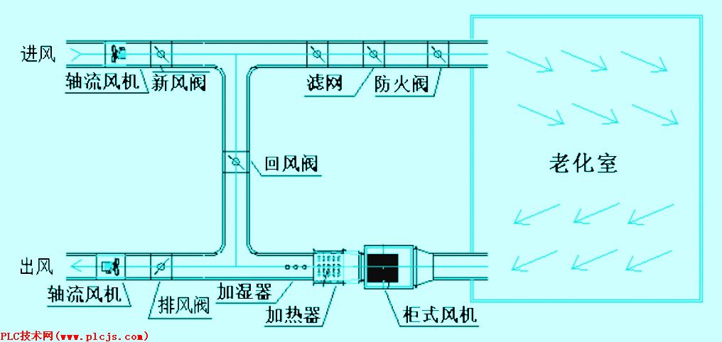在正常情况下(温湿度),关闭进风阀和排风阀,停止进风电机和排风电机,打开回风阀和防火阀,启动回风风机,保持老化房内回风循环。