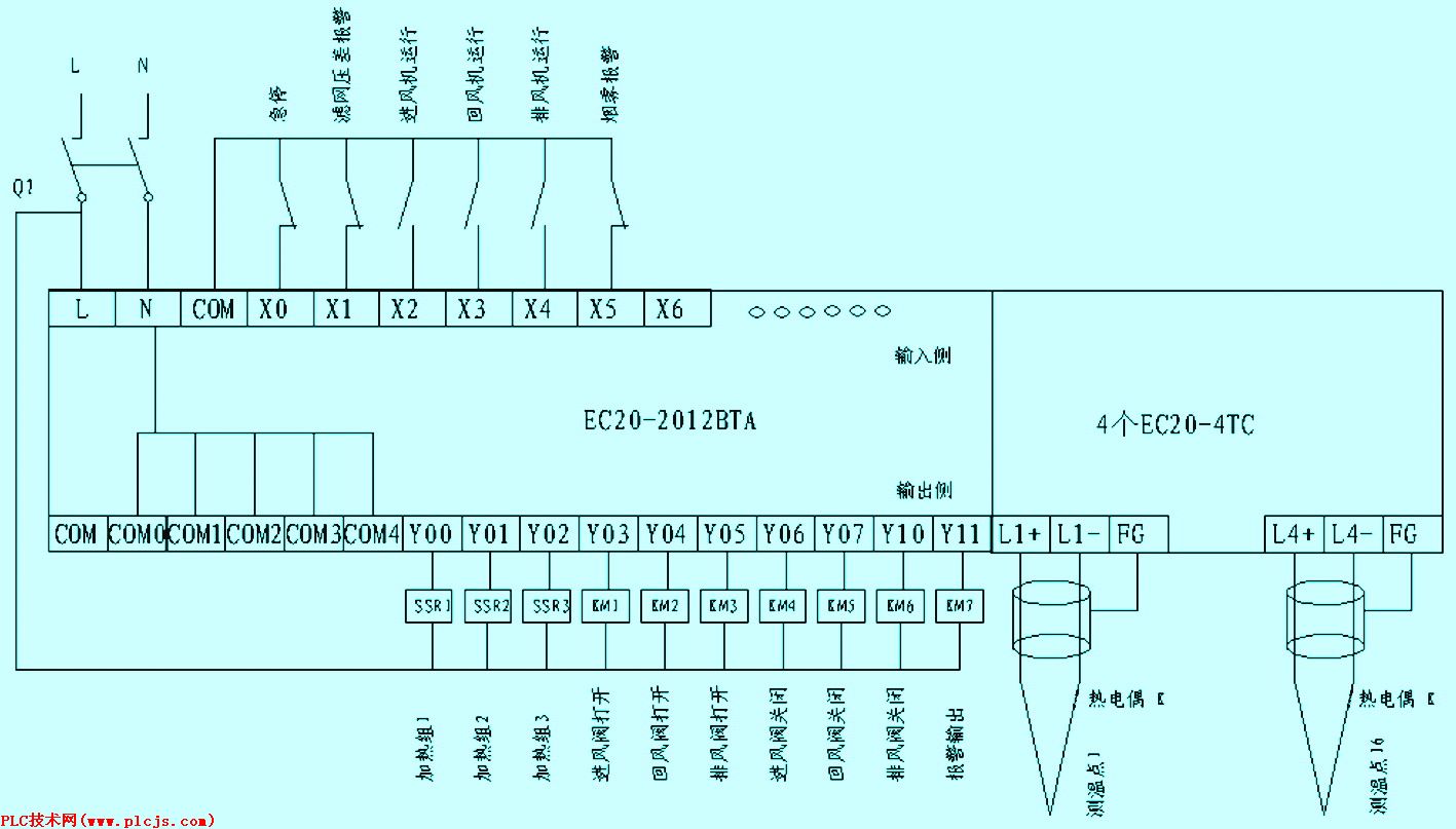 根据老化房工艺要求组成如上图控制系统:上位机采用台湾研华IPC(工控计算机);监控画面采用亚控公司的KINGVIEW软件,该软件操作简单,元件形象丰富,性能稳定;核心控制部分采用艾默生EC20-2012BTA类型的PLC和4个温度采集模块(EC20-4TC,接受K型温度信号);传动采用艾默生EV2000通用型变频器。