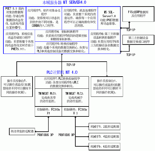 TWINCAT是完全开放的、基于PC的通用自动化系统,提供了一个独立于现场总线的I/O界面,并与WINDOWS的操作紧密结合。TWINCAT的开发规范遵循IEC61131-3标准,支持指令列表、结构文本、功能块、梯形图和顺序功能表等标准开发方式,可以依据各人的不同喜好灵活运用。TWINCAT与外部硬件的连接方式多种多样,可以通过TCP/IP、现场总线或计算机的COM端口将 软PLC实时系统与外部硬件端子连接。 利用TWINCAT,我们可以将一台普通PC机配置成为一台多PLC系统,并可以具有多任务执行的能力。在一台普通PC机上,我们最多可以配置4个独立的PLC实时系统同时运行,每个PLC实时系统都具有独立、并行地执行自身多任务的能力。同时,我们还可以灵活地指定该程序运行于PC机或总线控制器上。TWINCAT与其他NT程序的数据连接可以方便地利用Microsoft各种标准方法,如:COM,DCOM,ActiveX或OPC等方式。 在目前我们应用的TWINCAT系统中,配置了两个独立的PLC实时系统,其中一个主要作为机械手动作的监控,另一个主要作为传送带动作的监控。由于在该系统中有涉及到数据库、与第三方设备通讯以及操作界面等PLC无法完成的工作,因此开发人员用C++语言编写了若干个接口程序完成这些功能。由于通讯的对象较多,接口不同,为了方便编程及通讯,采用了CORBA(通用对象请求代理结构)技术。以下是整个系统的软件组态示意: