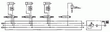 本文介绍了采用气动元件的物料搬运系统的结构、气动系统及其PLC控制系统。物料的搬运方式具有可抓可吸的多用途功能;气动系统电磁换向阀采用汇流板集装方式,减少了占用空间;PLC控制具有单步、自动等多种工作方式。 由于气压传动具有气源使用方便、不污染环境、动作灵活迅速、工作安全可靠、操作维修简便以及适于在恶劣环境下工作等特点,因而在冲压加工、注塑及压铸等有毒或高温环境下作业,机床上、下料,仪表及轻工行业中小零件的输送和自动装配等作业,食品包装及输送,电子产品输送、自动插接,弹药生产自动化等过程中被广泛应用。所以气压传动是一种易于推广普及的实现工业自动化的应用技术。气动系统的应用,引起了世界各国产业界的普遍重视,气动行业已成为工业国家发展速度最快的行业之一。 作为气动系统的控制装置目前多数采用可编程控制器(PLC)。可编程序控制器是以微处理器为基础,综合计算机技术,自动控制技术和通讯技术而发展起来的一种新型、通用的自动控制装置,其可靠性好,操作简便。在实际应用中,控制系统很容易实现。一般是由受控设备的动作顺序和工艺要求,构成工步状态表,形成梯形图,再编制PLC指令。 一、物料搬运系统结构设计 物料搬运系统原理图如图1所示。该系统由左右移动气缸1、复位进退气缸2、升降气缸3、夹手或真空吸盘4、物料块5、传感器6、圆柱导轨7、支架8、底座9、微动开关10等组成。夹手或真空吸盘4可以夹住或吸住物料块5,抓取物料的部分采用夹持式和吸附式两种形式,选用不同的形式,可分别完成工件的抓取和吸附,以适应不同种类的物料搬运。夹手采用电磁铁吸合与断开方式夹持物料。夹手或吸盘在升降气缸3的作用下可以上下移动;夹手或真空吸盘连同升降气缸在左右移动气缸1的作用下沿着圆柱导轨可以左右移动;在复位进退气缸2的作用下将物料块送回原始位置,为下一个工作周期准备,以实现循环。此系统能够实现物料在一个平面内的搬运。左右移动行程为300mm,上下移动行程为80mm,根据行程选择不同的气缸,气缸1、2行程为300mm,气缸3行程为80mm。气缸选用法兰式安装。为了防止工件偏移,在左右移动气缸1运动路径两边安置导向圆柱导轨7,将圆柱导轨用螺钉固定在支架8上;支架用螺栓固定在底座9上。