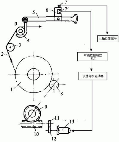 PLC控制步进电机在送经装置上的应用 采用PLC控制的步进电机的变频特性运用在纺织机的送经装置中很好地解决了经纱内部张力不均匀的问题,使产品的质量产生了质的飞跃。 (1) 经纱张力信号检测 本装置是通过检测后梁的摆动是否超出范围来检测经纱张力的波动是否满足要求,不满足要求时就控制送经装置予以调整。如图4,当经纱2的张力发生波动时,活动后梁4带动张力感应杆5绕点O摆动。当检测片6进入接近开关7的有效作用区时,接近开关7就发出一高电平信号。以PLC为核心的控制器根据这一信号和主轴位置信号,启动步进电机13,驱动织轴送出经纱。接近开关7’是极限张力检测开关。当经纱张力过大或过小时,检测片6将遮挡接近开关7’,7’输出的高电平信号到控制器后,控制器就会关掉织机,以便进行人工处理。主轴位置的检测是为了控制送经运动的允许时间,以避开打纬,保证纬纱能被打紧。主轴位置的检测同样采用的是接近开关非接触式检测。