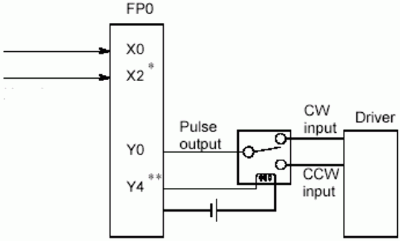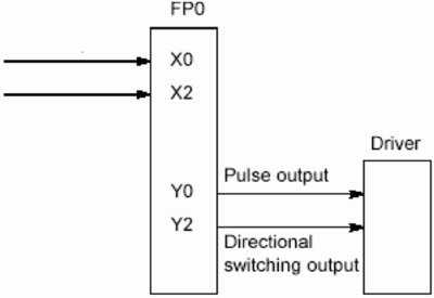 FP0-C16T型PLC有两个脉冲输出端Y0和Y1端,随着控制方式的不同,有三种脉冲输出形式。 (1) 这两个脉冲输出端可以用来作为两个不带加减速的单相脉冲输出端,主要使用PLS和SPD1指令进行控制,颠率范围为0Hz_10KHz,可以连续输出,也可以脉冲中形式输出,可以同时单独输出。 (2) 可以作为两相可变占空比的连续脉冲输出端,主要使用PWM指令控制,占空比设置范围为0%_100%。频率设置范围0.1Hz_999.9Hz。 (3) 可以作为带梯形加减速的两相脉冲输出,主要使用PULS和SPD1指令控制,频率变化范围0Hz_10KHz,加减速率10Hz/10ms_10KHz/10ms,可以连续输出,也可以脉冲串形式输出,这里又分为两种控制方式,一种是脉冲+方向控制(Y0、Y1输出脉冲,Y2、Y3输出方向),一种是正反向脉冲输出(Y0输出CW脉冲,Y1输出CCW脉冲)。如果使用Y0、Y2分别进行脉冲、方向控制,控制系统如图2所示。如果使用Y0作为脉冲输出,可以通过如图3所示的方法实现两相脉冲输出。