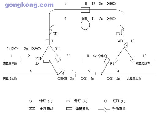 摘要: 本文介绍了SRM1可编程序控制器在煤矿井下“信号、集中、闭塞”系统中的应用。由PLC控制的该系统运行稳定、现场抗干扰性较强、具有连结方便、系统易于扩展等特点。 关键词: 可编程序控制器、集中联锁、井底车场 Abstract This paper designs and implements a “signal centralization interlocking”system of shaft station which uses SRM1 PLC as the main controller. The structure of system hardware and control way are described in the paper. It has many advantages, such as the high reliability 、strong anti-jamming ability、good system expansibility. Keywords PLC shaft station centralized interlocking 1. 前言 在现代矿井中巷道运送矿物、矸石、人员、材料及设备等的主要工具是电机车。为了保证机车运行的安全、高效,将井下道岔、信号灯、信号发送器等设备及控制信号集中到主控室控制,并根据现场需要实现它们之间的相互闭锁和解锁等,此构成的井下运输“信号、集中、闭塞”系统又简称信集闭系统,可实现运输区段相互闭塞,电气控制相对集中,调度实时监督控制等。我国煤矿井下信集闭系统大多数采用安全型继电器联锁控制来实现,该控制方式在设计时需绘制大量的电气原理图、接线图,设计工作量较大。随着煤矿不断开拓,井底车场线路发生变更时,控制系统修改工作困难,且系统完成功能也受到继电器控制的限制,有些功能不能尽人意。近几年,信集闭系统的控制联锁方式趋向多样化,除继电器联锁控制方式外,有设计采用微机联锁控制、可编程序控制器(PLC)联锁控制、可编程逻辑器件(PLD)联锁控制等方式。本文介绍我们用OMRON公司SRM1可编程序控制器(PLC)做井下信集闭系统的主要控制器并与其它I/O模块构成基于CompoBUS/S现场总线的远程控制网,实现机车运行和系统设备的集中控制、联锁和模拟盘实时运行监视、自动/人工车辆调度,从而保证井下机车运输安全,提高运输效率,减轻劳动强度,降低能源消耗。该系统运行稳定、现场抗干扰性强、具有连结方便、系统易于扩展等特点。 ![]() 图一为某矿井底环形车场平面布置图。车场东西两翼2.5Km,各翼分别布置有一条重车道和轻车道,向北0.4Km 和0.9Km分别至副井罐笼和主井翻车笼。图中详尽地标明了车场结构、区段划分和电动道岔、弹簧道岔、人工道岔、色信号灯等设备的布置情况。根据该矿生产实际,列车或机车在此车场内共有十种作业:1)、将西翼发来的煤车(重车)调到主井后,机车返回区段8待命;2)、将西翼发来的矸石车或其它车辆调到副井,机车返回区段8待命;3)将东翼发来的煤车调到主井后,机车返回区段8待命;4)将东翼发来的矸石车或其它车辆调到副井,机车返回区段8待命;5)机车由区段8调往主井;6)机车由区段8调往副井;7)将主井空车(轻车)发往西翼;8)将主井空车发往东翼;9)将副井空车或材料车等发往西翼;10)将副井空车或材料车等发往东翼。此10种作业又可按完成作业时所经车场区段划分为14条进路,其中共用一个运行区段或一组道岔的两个进路则互为敌对进路。为防止机车发生碰头、侧撞、追尾等事故,互为敌对进路不允许同时开放并进行电气闭锁,所以全车场共设八台色灯信号机、五台电动转辙机对进路或有关区段进行防护,各进路联锁如下表所示。 |