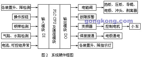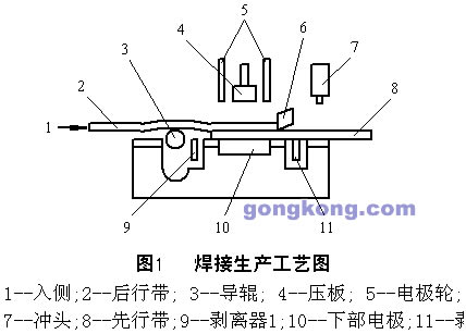 【摘 要】 在武钢硅钢厂滚焊机电气改造中应用PLC组成两级监控系统,它具有完善的故障处理功能。本文简要介绍了生产工艺流程及主要控制功能的实现,着重论述了PLC在系统中的功能及其软、硬件的设计方法。系统投入运行后取得了良好的经济效益。 【关键词】 滚焊机;PLC;通信;状态设计法 武钢硅钢厂在生产硅钢带时,为连续生产,用滚焊机将前后两卷钢带首尾焊接,生产工艺完成后,再由剪切机切割分开,以提高生产效率。该厂的滚焊机系统是70年代从日本全套引进的,经过20多年的长期运行,电气设备老化严重,动作可靠性差,严重影响正常生产。在对其电控系统的技术改造中,用先进的PLC控制取代继电器逻辑控制,添加通信功能,实时显示各主体设备的状态变化及故障报警画面,组成控制、监管相结合的一体化系统。 1 生产工艺简介 焊接时,两卷钢带首尾搭接,在接触面流通强电流,接触电阻及金属固有电阻产生电阻热,使焊接接点温度达到金属可熔化的适当温度,同时对其加压使之接合。 钢带焊接生产工艺如图1所示。主要由钢带搭接定位、压紧,钢带焊接,焊接复位、作业线运行三个阶段组成。简介如下。 运行中的先行带经钢带检测器检测到末端时,停止在下部电极上→挡板下降→后行带前进至挡板位置与先行带搭接→导辊下降→压板下降→电极下降→小车前进。 钢带检测器、电极轮及其升降装置搭载在小车上,小车前进到钢带上方时,钢带检测开关由OFF→ON,使电极通电开始焊接。焊接电流的传导方向为:焊接变压器→电极轮1→焊接钢带→下部电极→电极轮2→焊接变压器。当焊接到钢带边沿时,钢带检测开关变为OFF而使焊接停止。 ![]() 小车前进到“前进极限点”停止→冲头下降,延时0.5S后自动上升→电极、挡板、压板依次上升→剥离器上升,使钢带脱离下部电极,延时2S后剥离器下降→导辊上升。 以上过程即完成一个单程焊接。为加固两带焊接,通常需来回焊接两次,即再增加一次后退焊接。当需后退焊接时,先将两钢带重合部向前移动一段(但不得偏离下部电极),再按以上次序将焊机各装置重复动作一次,所不同的是小车此次为后退运行,并后退到“原位置”停止。此时启动作业线又可循环运行。 2 系统硬件配置 根据生产工艺,采用典型的两级监控方式。上位机为生产管理级,完成对下位机的监控、生产操作管理等,主要面向操作人员;下位机为基础测控级,完成生产现场的数据采集及过程控制等,面向生产过程。 上位机选用国内广泛应用的研华IPC-610工控机,配有PIII处理器、64MB内存,具有较高性价比。因现场通信距离较远,配置一块RS422/485通信卡,用双绞线将其串口与PLC通信模块(AJ71UC24)RS422端口相连,以串行通信方式完成二级间通信,实现监控焊接过程。上位机RS232口经适配器(SC-09)转换与PLC CPU模块连接,用于对PLC控制软件的编程。 钢带生产现场噪声干扰及环境污染严重。我们选作主控单元的三菱公司A2A系列PLC,采用模块式结构,可靠性高,配置灵活,且具有良好的环境适应性和抗干扰能力;使用简单,只需相应外设或编程软件包(如MEDOC),即可完成控制程序的编写。它负责焊接工艺的电气逻辑控制,包括各焊接设备的状态检测、钢带检测;执行逻辑、算术运算;输出执行指令,完成小车前后运行、焊接启停、各电磁阀及状态过程等的控制。PLC控制系统硬件配置如图2所示。 ![]() 3 系统优化及功能实现 系统设有自动/手动2种控制方式,由选择开关转换。由于钢带搭接定位时的不确定性,故以手动操作为主要控制方式。自动方式仅在手动操作将钢带搭接定位、压紧后,才自动按预定逻辑顺序运行。当系统发生紧急故障时,按急停按钮可终止当前所有设备运行;当设备出现故障或工艺参数不正常时,由PLC启动灯光及蜂鸣器报警,且仅当故障排除后,才能有效通过按钮使报警复位。焊机设备工作时,PLC控制主电控柜上的对应状态指示灯亮,上位机模拟显示现场各机电设备的动作,方便了中控室操作员对整个工艺流程的监视。 |