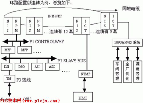 2、DCS、INFI90以及炼钢厂生产网络配置图 DCS集散控制系统是以微处理器为基础的集中管理和分散控制系统。功能上分层为现场控制级、过程装置控制级、车间操作管理级、全厂优化和调度管理级等,随之形成了生产中的不同分工和相关的职能部门,使生产线与服务线实现一条龙。IEEE802.4令牌总线传输方式和IEEE802.5令牌环网传输方式的通信协议在DCS系统中应用最广,令牌环网的工作原理是在一闭环网中利用唯一的“令牌TOKEN”短帧不停的在环路中流动,寻找需要发送信息的站,只有截获该TOKEN才有权发送;而且只要有一个站发送信息,环路中就不再有空闲的令牌流动,从而在重载下可以高效地工作,截获后将令牌的独特标志转变为信息帧的标志,转一圈后,必然回到发送的源站点,检查返回数据,诊断发送成功与否。释放令牌,继续流动寻找。 INFI90是贝利公司开发的典型DCS系统,上世纪70年代以来,得到广泛的应用,成为当时过程工业自动化控制的主流代表,以其人员分散、地域分散、功能分散、危险分散、设备分散及操作分散,来提高设备的可利用率。炼钢厂连铸环路中共分散有有22(12+9+APMS)个站点;每个站点有1~3个控制器(MFP)组成过程装置控制级;HMI实现车间操作等等均以其DCS功能定义来构成一个完善的生产网络。NIS/NPM构成的站站间以令牌协议传输,下挂的19个控制器形成CONTROLWAY通讯,子模件间有其扩展总线,管理层又依靠TCP/IP进行监视,因此各层众多独立的协议也是DCS一大缺陷。该系统在炼钢厂不断完善中发挥到了淋漓尽致,其网络配置示意图如图2。
