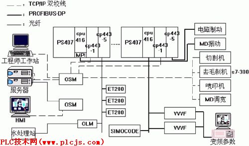 Profibus-DP主要用于工业自动化系统的高速数据传送,实现调节和控制功能,是一种高速低成本通讯,用于设备级控制系统与分散式I/O的通讯;CP443-1是以TCP/IP协议进行通讯,下挂EWS工程师站、服务器等等,CP443-5则是以PROFIBUS协议下挂VVVF、ET200等工控产品,其网络简单,容易维护;由于输入、输出模件ET200是总线传输形式,安在现场的节点,节省了大量的信号线缆,这也正是有别于DCS的最大优势所在。 炼钢厂2号连铸主系统使用6个PLC处理器,双服务器热备,其中VVVF拥有两条总线,用于与PLC信息通讯和专机读取、下装变频参数。 4、DCS/FCS比较 (1) 开放性和可互操作性 开放性FCS将打破DCS大型厂家的垄断,给中小企业发展带来了平等竞争的机遇。可互操作性实现控制产品的“即插即用”功能,从而使不同厂家的工控产品可以互换和替换。 (2) 分散性 彻底的分散性意味着系统具有较高的可靠性和灵活性,系统很容易进行重组和扩建,且易于维护。 【1】【2】 本新闻共2页,当前在第1页1 2