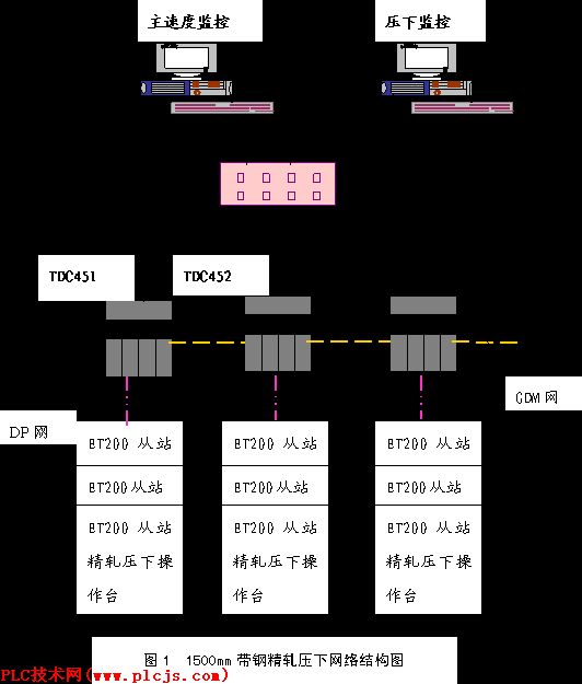 结合本生产线工艺布置和特点,控制系统使用了三套西门子TDC控制器(SIMATIC Technology and Drive Control——即工艺和驱动自动化系统),每套TDC控制器中配置4个CPU,下挂3个ET200远程I/O从站。两台DELL工控机作为上微机监控,负责维护集成历史数据库和提供人机接口,访问TDC中的数据。精轧生产线控制系统结构图1所示。