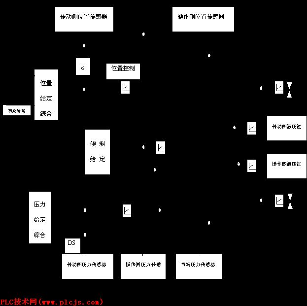 在现代热连轧机组中,液压APC一般作为液压AGC的内环,执行厚度外环液压AGC控制向其输出位置(或轧制力)的动态调节量,即辊缝调节量。也就是说液压APC是液压AGC的执行机构,并进行轧辊的倾斜控制;其次用于轧辊精确预摆辊缝,同电动压下机构联合实现轧辊的校平。控制系统直接将辊缝设定换算为液压缸的位置给定,由当前位置向目标位置积分来作为位置参考值。作为液压APC,还可以是将轧制力设定换算为液压缸的油压给定。为获得好的板形,在最后一、二个机架,采用液压轧制力控制,实现恒轧制力控制。液压APC控制框图如图2所示。
