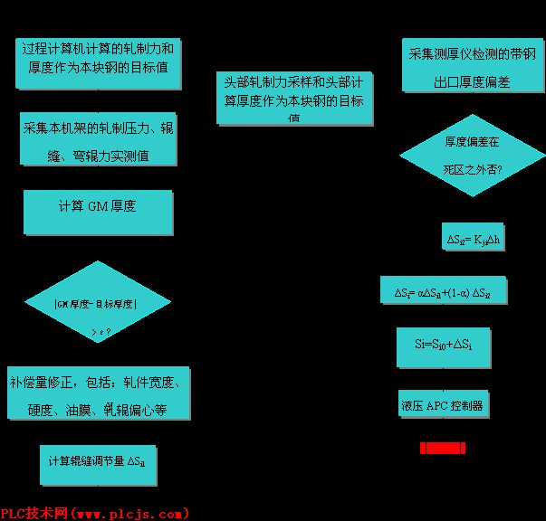 (2)绝对AGC运行方式:以过程计算机计算的目标厚度和预报轧制力作为目标厚度和锁定各机架轧制力进行自动厚度调节,追求与要求的成品厚度差最小。当实测带钢出口厚度与给定的目标厚度之差超过某极限值时,将以实测值作为本块钢的给定目标厚度。