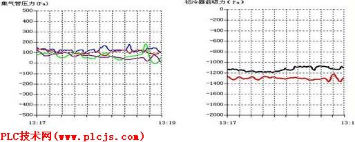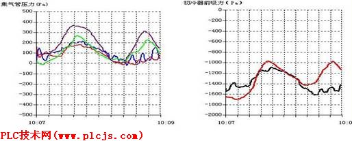 经过很长一段时间对原有系统的观察,发现湘钢焦化厂的原有控制系统存在如下情况:①集气管压力波动大,在焦炉加高压氨水或者机后压力很大的时候,压力有时能达到400Pa左右,焦炉严重冒烟,有时煤气发生量小或者机后压力很小的时候,压力能达到-300Pa左右;②初冷器前吸力经常达到最大值,并且经常出现急剧上升和下降的现象;③当集气管处于高压或者低压,并且长时间不能下来或者上去时,操作人员不得不开大或者关小机前闸阀,这种情况在每个班都要出现好多次,特别是夜班更多。④1#和2#,3#和4#集气管压力耦合现象严重。如图2、图3所示。