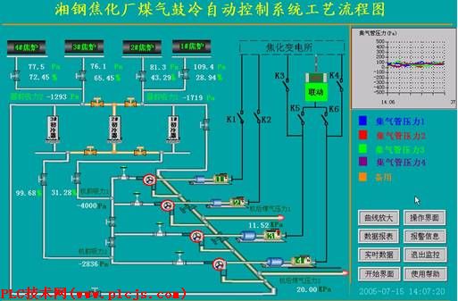 在焦炉炼焦过程中,会有大量的荒煤气产生,荒煤气由集气管收集,通过输气管网由鼓风机送往后续工段处理。由于产气量随结焦时间而变化,集气管中的压力不断改变,特别是在炭化室进行推焦、装煤时会造成集气管压力大幅波动。当炉体内操作形成负压时,空气就会从炉门、炉盖等处进入炉体,导致焦炭燃烧、灰分增加、焦炭质量下降。进入的空气还会同炉体建筑材料发生化学反应,导致炉体剥蚀,缩短炉体使用寿命;空气还会促使荒煤气燃烧,使煤气系统温度增高,从而加重了冷却系统的负担,产生不必要的能源消耗。当炉体内的压力过高时,荒煤气将会从炉门、炉盖等处冒出,一方面造成跑烟冒火,污染环境;另一方面降低了荒煤气的回收率,造成能源的浪费[1>。综上所述,集气管压力的稳定不但影响焦炭的质量,也关系到焦炉的寿命。所以我们必须对集气管压力进行控制,使其维持在设定的压力范围内,考虑到焦炉集气管压力控制对象的数学模型难以建立,本文以湘钢焦化厂工艺过程控制技术改造项目为研究对象,利用经典控制与智能控制相结合进行集气管压力的控制。