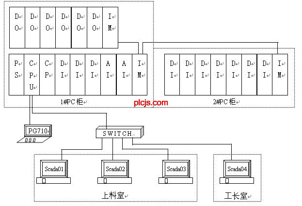 3.4、硬件部分继续使用原西门子S5系列的电源、控制器(CPU)、接口、通讯等模板,去掉原来ET100U模块和模拟屏操作台,增加Scade01、Scade02、Scade03、Scade04四台工控计算机,它们通过网络连接器Switch与PLC控制柜相连。整个网络系统通过工业以太网连接,每台工控计算机都安装CP1413网卡,并通过其与CPU进行通讯。另外,在原有输入输出模板不变情况下,增加一块模拟量输入模板,用来显示仪表数据,主要是秤值。硬件系统的网络结构见图2。