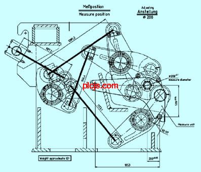图1 三滚抱芯的机械结构图 三个导辊按照120o分布,其中下面两个导辊,上面一个导辊,三滚的内切圆直径即为其导向物料的外径。三个导辊由同一个液压缸控制,油缸的动作通过一系列的机械机构可以同时改变三个导辊的位置,(三辊的内切圆直径)。一般根据工艺不同,穿孔区一般安装6组三辊抱芯装置,每个三辊抱芯前有2对热探。 3 三辊抱芯控制
