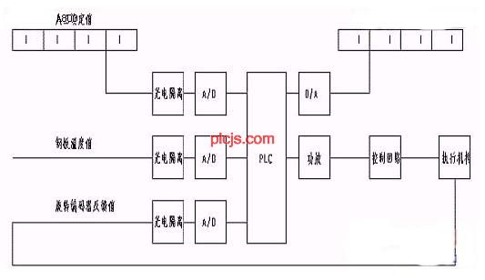 控制原理是:操作工首先通过操作盘输入预切钢板的宽度值,旋转编码器反馈回钢板实际宽度,同时远红外测温仪将检测到的钢板温度传送给PLC系统,PLC系统根据预设值、反馈值、温度值采用PI调节,输出剪切位置控制信号,控制直流电机,以精确控制钢板宽度剪切位置。