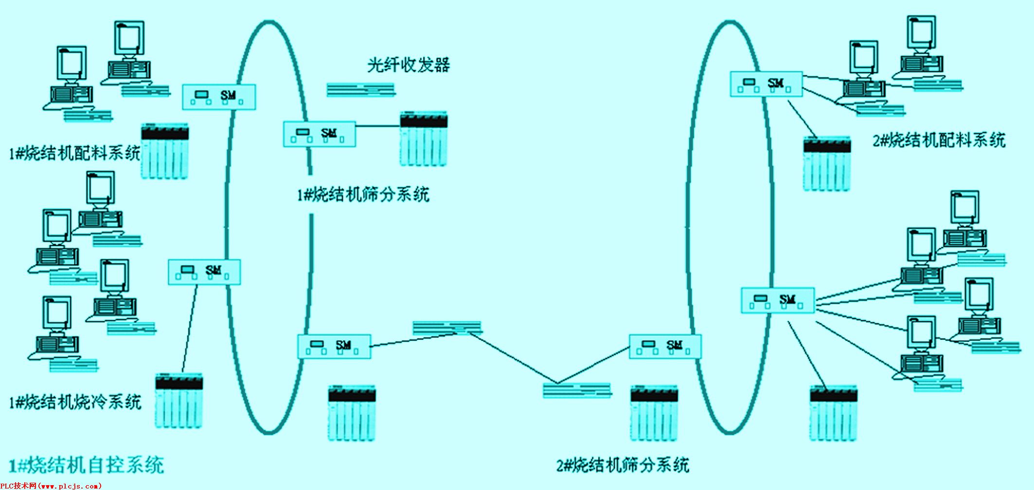 某型钢烧结厂1#265烧结机工程于2004年5月份投产,其控制系统包括烧冷、配料、燃料、筛分4套PLC站,各站之间通过光纤连接构成工业以太环网,上位监控系统采用C/S结构通过交换机与这4套PLC站进行实时通讯。2#265烧结机于2005年1月份投产,其控制系统包括烧冷、配料及燃料的一个远程站、成品3套PLC站,控制原理与1#265烧结机基本相同。但就烧结生产实际现状来看,成品料线和燃料为一期和二期烧结公用部分,两期烧结根据生产随时都要开停此部分设备,如依据工程建设人为划分为2套独立烧结机将很不现实,甚至造成成品料线的混乱,影响烧结的正常生产。为此急需将2个独立的主控室合并为一个综合控制室,由此发出指挥两期烧结生产的各种命令并对烧结生产情况进行全面监控。