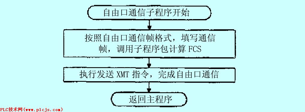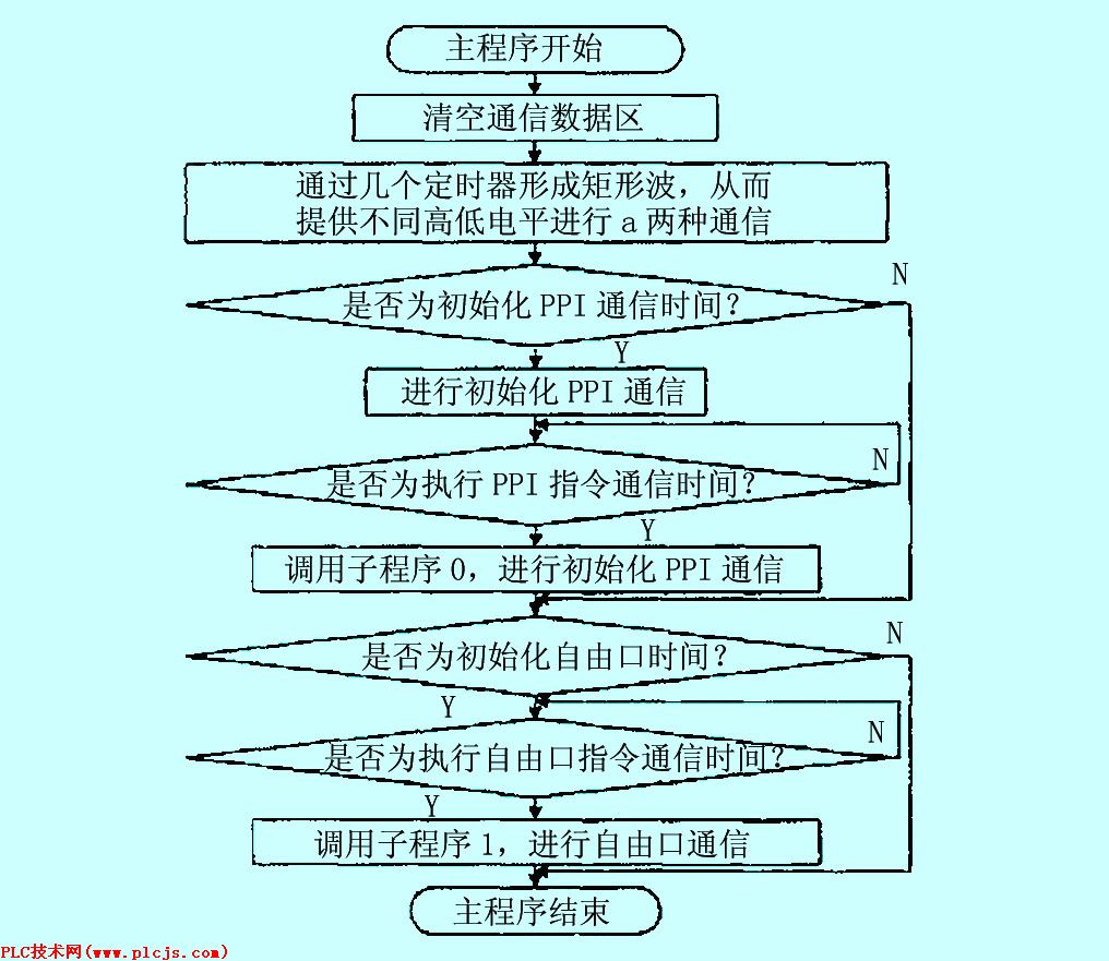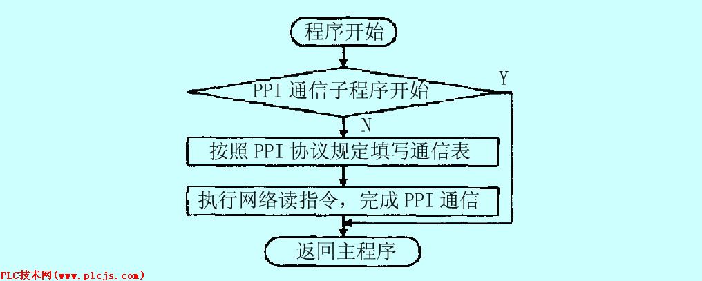 在S7-200网络通讯中,可以实现两种通讯协议进行通讯而不互相干扰。但前提是两种协议的波特率必须相同,由于只有一个通讯口,波特率只支持9600波特,因此在多协议通讯时,波特率设置为9600波特。对于多协议的组合方式,作者采用了总线分时复用法,在总线分时控制中,作者通过几个定时器组成矩形波,从而形成高低不同时段分别进行PPI协议通讯和自由口通讯。主程序流程图见图2。PPI通信程序流程见图3。自由口通信程序的流程见图4。