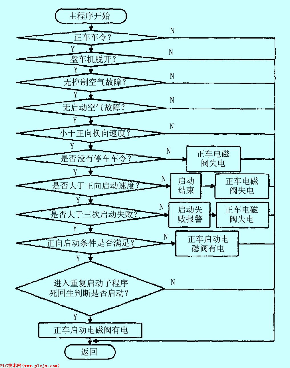 慢转控制所要考虑的情况分别是主机停车时间超过30min和电源断电后恢复供电两种情况。在主机转过一圈或有紧急操纵信号的情况下,可以撤消慢转控制。停车控制所要考虑的情况共分4种:停车指令,故障停车信号,车令与运转方向不一致以及起动电磁阀工作期间。重复起动控制又分为4个子程序:起动时间监视子程序,换向时间监视子程序,起动间歇延时子程序和重复起动次数计数子程序。以上程序流程图由于篇幅所限,在此不一一赘述。