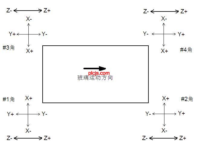 图6 各轴点动 (5)开机步骤。开机--〉开皮带--〉各轴回原点--〉开砂轮--〉启动自动加工程序。 2.2原理设计 轴向定义。该设备工作原理是每个角利用Z轴带动一个XY工作台跟随玻璃前进,使XY工作台与玻璃之间保持相对静止,XY轴带动砂轮运行标准圆弧或直线即可加工出所需要的倒角。四个角XYZ轴均由伺服控制,参见图7。