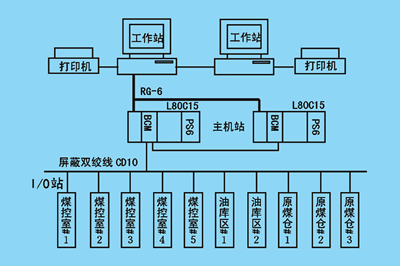 PLC控制系统是该程控系统的核心,其采用工控机为上位机、PLC系统为下位机的两级控制模式,上、下位机均分别采用双机热备形式,以确保在万一有一台PLC主机或一台监控用工控机发生故障或死机的情况下,整个系统仍可照常运转。上位机采用研华工控机,共设2台,分别用于程控部分的操作和监视。系统软件基于WindowsNT4.0(加装中文之星),并配以美国AB公司RSView32人机接口软件。PLC选用美国Allen-Bradley公司PLC-5/40系列,采用RSLogix5软件编程。CPU(型号1785-L40C15)采用双机热备,除本地站外设10个远程站,其中5个在控制室,3个在煤仓层、2个在油泵房。本地站与远程站之间通过屏蔽双绞线(AB公司1770-CD10)通讯,采用双缆备用方式,上位机与下位机之间通过屏蔽同轴电缆(AB公司1786-RG6)构成CONTROLNET网进行通讯。系统结构见图1。