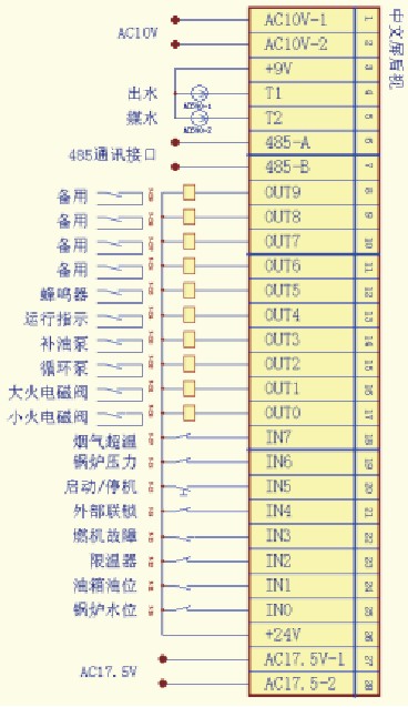 该系列控制器是针对燃油(气)、电热水锅炉的专业控制器产品,集成度高、可靠性高、智能化程度高、抗干扰能力强、操作简单,能够在各种恶劣环境中全天候运行。 1、高性能的工业级控制芯片 系统控制核心CPU采用Rabbit 3000 CPU,它是工业级的高性能单片机,可靠性高、集成度高、速度高、功能强、体积小、功耗小。 2、软硬件高度集成,一体化全内置设计 系统的电源、模拟量输入、图文显示、数字量输入输出及智能控制都集成在一块电路板上,提高了系统的可靠性。 3、大屏幕液晶图文显示,人机界面友好 专为国内用户设计的液晶(128*64)图文操作界面,以图形动画和中文方式显示锅炉运行工况、工作模式和控制参数等。 4、专用数字滤波技术 系统对采集的温度数据进行数字滤波,保证了测量数据的稳定性和准确性。 5、开关量光电隔离措施 系统所有输入输出端口都采取了专门的光电隔离措施,有效阻断干扰通道,提高抗干扰能力。 6、内置网络接口与网络通讯协议 485工业通讯总线接口以及以太网接口,内置标准MODBUS/RTU/ASCII以及MODUBS/TCP通讯协议,连接上位计算机可组成锅炉控制监控系统,亦可与锅炉DCS集散控制系统连接。 锅炉专用控制器的性能指标 控制器点数 模拟量:8路 输入数字量:8路 输出数字量:10路 温度测量范围 水温:-50℃---150℃精度±0.3℃ 控制对象 燃烧器、电热管、系统循环泵、补水泵、补水阀、补油泵 控制功能 多级温度自动调节、多种安全措施、密码保护、电热管均衡工作 故障保护 燃机故障、缺水、超温、超压、测温、缺相、燃料等故障 运行模式 人工、定时 定时时段 工作日、休息日分别8段/天(每段可设定不同的目标温度) 通讯接口 485工业总线,通讯距离1000m;以太网接口 适用条件 9~36VDC 温度范围:0℃--70℃ 相对湿度:95%,不结露 锅炉专用控制器的中文显示界面 锅炉专用控制器接线图 中文屏控制器 应用于实际锅炉 监控界面 远程设定界面 构成监控网络 |