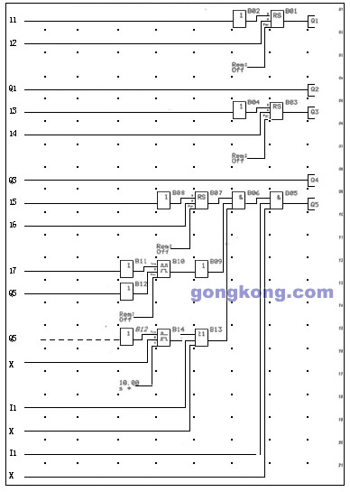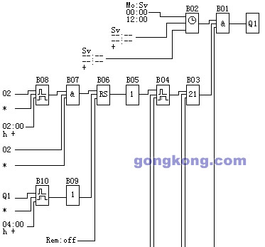 要求 两台风机,水泵分为两组互为备用;以12小时为时间单位交替运行。水泵由液位控制分上、中,下三个液位;当上、中液位或上液位无信号时关闭水泵;当三个液位都无信号时同时开启两组水泵。当水泵关闭一小时后风机开两小时。 LOGO!的解决方案 利用 LOGO!的实时时钟功能每12小时对两组水泵交替控制,水位仪的上、中、下三个液位接点接入 LOGO!I1、I2、I3 ![]() ![]() 使用的部件 LOGO! 230RC I1上液位 Q1风机1接触器 I2中液位 Q2风机1接触器 I3下液位 Q3风机2接触器 Q4风机2接触器 优点和特点 替代原用PLC,现用LOGO!,电器元件的数量大大减少,降低成本,减小安装空间而可靠性却有所提高。 ![]() |