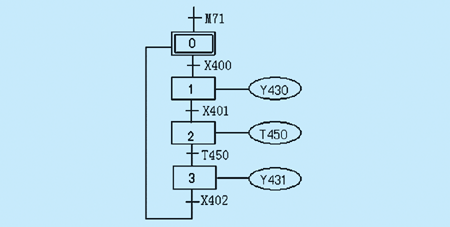 例如:某PLC控制的回转工作台控制钻孔的过程是:当回转工作台不转且钻头回转时,若传感器X400检测到工件到位,钻头向下工进Y430当钻到一定深度钻头套筒压到下接近开关X401时,计时器T450计时,4s后快退Y431到上接近开关X402,就回到了原位。功能表图见图1:
