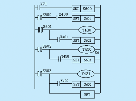 步进梯形指令是专门为顺序控制设计提供的指令,它的步只能用状态寄存器S来表示,状态寄存器有断电保持功能,在编制顺序控制程序时应与步进指令一起使用,而且状态寄存器必须用置位指令SET置位,这样才具有控制功能,状态寄存器S才能提供STL触点,否则状态寄存器S与一般的中间继电器M相同。在步进梯形图中不同的步进段允许有双重输出,即允许有重号的负载输出,在步进触点结束时要用RET指令使后面的程序返回原母线。把图1中的0-3用状态寄存器S600-S603代替,代替以后使用步进梯形指令编程,对应的梯形图如图3所示。这种编程方法很容易被初学者接受和掌握,对于有经验的工程师,也会提高设计效率,程序的调试、修改和阅读也很容易,使用方便,程序也较短,在顺序控制设计中应优先考虑,该法在工业自动化控制中应用较多。