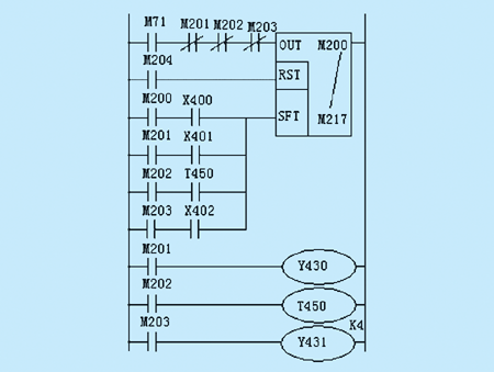 如图5为使用置位复位编程方式编制的与图1顺序功能图所对应的梯形图。在以置位复位指令的编程方式中,用某一转换所有前级步对应的辅助继电器的常开触点与转换对应的触点或电路串联,作为使所有后续步对应的辅助继电器置位和使所有前级步对应的辅助继电器复位的条件。对简单顺序控制系统也可直接对输出继电器置位或复位。该方法顺序转换关系明确,编程易理解,一般多用于自动控制系统中手动控制程序的编程。