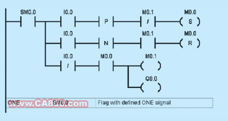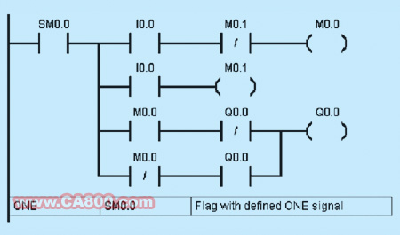 图2程序中正是充分利用了PLC程序的执行的特点,现在分析一下它的工作过程。按一下按钮,使I0.1变为“1”,在第一个PLC扫描周期内,M0.0变为“1”,M0.1变为“1”,M0.1等于“1”会使M0.0变为“0”,但M0.0的状态变化要到下一个PLC扫描周期才会执行,可见M0.0是宽度为1个PLC扫描周期的脉冲信号。因为M0.0等于“1”,这样会使原来状态为“0”的Q0.0变为“1”。从第二个PLC扫描周期起,不论I0.1变为“0”或保持为“1”,M0.0变为“0”并稳定在“0”上,这样Q0.0通过M0.0常闭点与Q0.0常开点串联的支路保持为“1”状态。再按一下按钮,M0.0又产生宽度为1个PLC扫描周期的脉冲信号,这个脉冲信号使原来状态为“1”的Q0.0变为“0”并稳定在“0”上。如此每次按一下按钮,Q0.0就在“0”和“1”之间切换一次,形成双稳态信号。