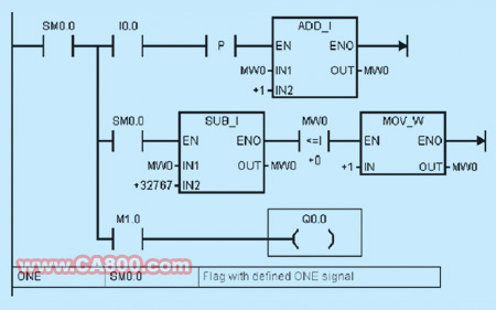 图3所示的程序借鉴了数字电路中的D触发器的工作原理,按钮I0.0每按下一次,就相当于给触发器的CP端输入一个触发脉冲,相加所得“和”的最低位状态就翻转一次,如果Q0.0取自最低位,就可得到周期性状态在“0”、“1”之间改变的双稳态信号。为了避免加法的计算结果溢出,判断如果累加到16位整数所能表示的最大值32767,就重新开始累加。
