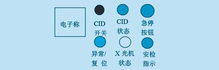 图2示出了值机面板图。使用值机柜台前,打开钥匙开关,值机系统进入正常工作状态。每个值机面板有4个状态指示灯,显示值机当前行李状态。