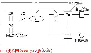 输出继电器是用来将PLC内部信号输出传送给外部负载(用户输出设备)。输出继电器线圈是由PLC内部程序的指令驱动,其线圈状态传送给输出单元,再由输出单元对应的硬触点来驱动外部负载。如图1所示为输出继电器Y0的等效电路。