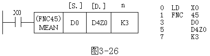 图1 功能指令表示格式 图1中源操作数为D0、D1、D2,目标操作数为D4Z0(Z0为变址寄存器),K3表示有3个数,当X0接通时,执行的操作为[(D0)+(D1)+(D2)]÷3→(D4Z0),如果Z0的内容为20,则运算结果送入D24中。 功能指令的指令段通常占1个程序步,16位操作数占2步,32位操作数占4步。 |