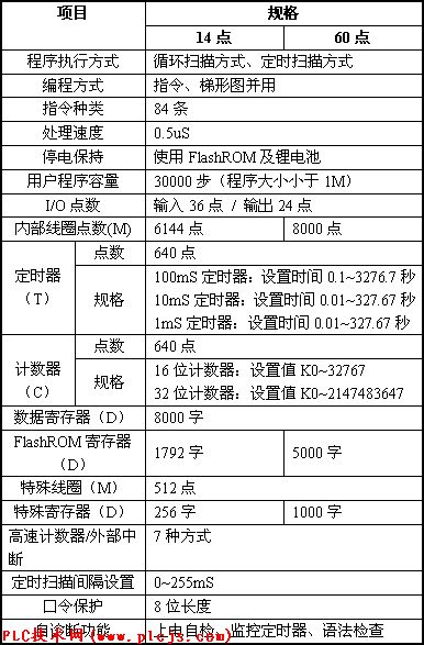 无锡信捷电子最新推出的XC系列PLC是功能强大的小型可编程控制器,堪与国际品牌比肩。该系列产品可满足多样化的控制需要。由于具有紧凑的设计、良好的扩展性能、低廉的价格以及强大的功能,使得XC系列可以成为小规模控制的完美解决方案。 ![]() (左)14点主机(右)32点主机 XC系列可编程控制器的编程具有如下特点: ●支持2种编程语言 在XC系列可编程控制器中,除基本的指令表编程方式外,还可以采用在图形画面上进行阶梯符号作图的梯形图编程方式。而且,这2种程序可相互转换。 ●充实的基本功能 基于“基本功能、高速处理、方便使用”的理念,XC系列可编程控制器除了支持顺序控制的有关功能外,还具有数据的传送和比较、四则运算及逻辑控制、数据的循环和移位等基本的应用指令,还有中断、高速计数器专用比较指令、高速脉冲输出等高速处理指令。 ●在高速输入计数中可利用单相或双相高速计数器 由于可编程控制器内的一般计数器在扫描周期内动作,因此其响应速度一般为数10Hz左右。XC系列可编程控制器内置的高速计数器,对来自于特定的输入继电器的高速脉冲进行中断处理,因此与扫描周期无关,可以进行高达60KHz的计数。 XC系列PLC的产品概述及编程方式 产品概述 XC系列可编程控制器 ·输入输出14~60点 ·内置FlashROM储存器 ·实时时钟:内置时钟,锂电池掉电记忆。 ·基本指令:27种 应用指令:89种 ·具备双通讯口,可连接仪表打印机等外设,通讯口2可选择RS-232或RS-422 ·指令丰富,编程方便。 编程方式 《指令表编程》 指令表编程是以“LD”、“AND”、“OUT”等顺控指令输入的方式。这种方式是编写顺控程序的基本输入形式,但可读性比较差。 例: 步 指令 软元件号 0 LD X000 1 OR Y005 2 ANI X002 3 OUT Y005 《梯形图编程》 梯形图程序是采用顺控信号及软元件号,在图形画面上作出顺控电路图的方法。这种方法是用触点符号与线圈符号表示顺控回路,因而容易理解程序的内容。同时还可用回路显示的状态来监控可编程控制器的动作。 例: ![]() 互换性 以上2种方法编制的顺控程序,全部以指令表方式储存在可编程控制器的程序内存中。因此,这2种输入方法编制的程序表示及编辑都可相互交换。 XC系列PLC的型号和种类 XC系列主机 ![]() 1、系列名称 2、输入输出点数 3、输出形式 R:继电器输出 T:晶体管输出 RT:继电器与晶体管双输出 4、供电电源 E:AC电源 C:DC电源 5、内置时钟 S:带内置时钟 ![]() 注:继电器与晶体管双输出的只有Y0,Y1是晶体管输出,其它是继电器输出。 开关量扩展模块 ![]() 1、系列名称 2、E:扩展模块 3、输入点数 4、X:输入专用 5、输出点数 6、输出形式 YR:继电器输出专用 YT:晶体管输出专用 ![]() 一般规格 ![]() 性能规格 ![]() 相关链接 XC系列可编程序控制器操作手册 |