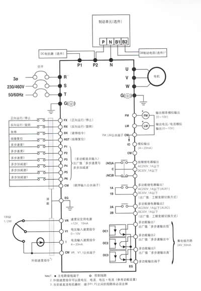 到电机输出端子(3相,200~230VAC或380~460VAC) |    |