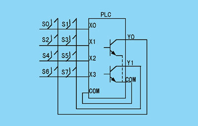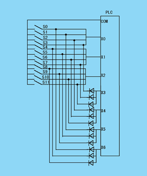 PLC的一个重要的特点就是各组输入、输出点的独立性较强,这一点主要表现在输入、输出点的公共端上。一方面,单独的输入、输出点可以有自己的公共端另一方面,多个输入、输出点可以共用一个公共端,这样输入、输出点相互间的组合就比较容易。通过这些组合,我们可以借用矩阵键盘扫描原理和输入节点组合矩阵的原理来增加输入点数目。