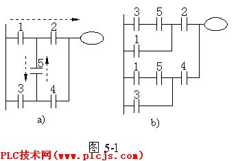 | PLC是专为工业控制而开发的装置,其主要使用者是工厂广大电气技术人员,为了适应他们的传统习惯和掌握能力,通常PLC不采用微机的编程语言,而常常采用面向控制过程、面向问题的“自然语言”编程。国际电工委员会(IEC)1994年5月公布的IEC1131-3(可编程控制器语言标准)详细地说明了句法、语义和下述5种编程语言:功能表图(sequential function chart)、梯形图(Ladder diagram)、功能块图(Function black diagram)、指令表(Instruction list)、结构文本(structured text)。梯形图和功能块图为图形语言,指令表和结构文本为文字语言,功能表图是一种结构块控制流程图。 梯形图是使用得最多的图形编程语言,被称为PLC的第一编程语言。梯形图与电器控制系统的电路图很相似,具有直观易懂的优点,很容易被工厂电气人员掌握,特别适用于开关量逻辑控制。梯形图常被称为电路或程序,梯形图的设计称为编程。 梯形图编程中,用到以下四个基本概念: 1.软继电器 PLC梯形图中的某些编程元件沿用了继电器这一名称,如输入继电器、输出继电器、内部辅助继电器等,但是它们不是真实的物理继电器,而是一些存储单元(软继电器),每一软继电器与PLC存储器中映像寄存器的一个存储单元相对应。该存储单元如果为“1”状态,则表示梯形图中对应软继电器的线圈“通电”,其常开触点接通,常闭触点断开,称这种状态是该软继电器的“1”或“ON”状态。如果该存储单元为“0”状态,对应软继电器的线圈和触点的状态与上述的相反,称该软继电器为“0”或“OFF”状态。使用中也常将这些“软继电器”称为编程元件。 2.能流 如图5-1所示触点1、2接通时,有一个假想的“概念电流”或“能流”(Power Flow)从左向右流动,这一方向与执行用户程序时的逻辑运算的顺序是一致的。能流只能从左向右流动。利用能流这一概念,可以帮助我们更好地理解和分析梯形图。图5-1a中可能有两个方向的能流流过触点5(经过触点1、5、4或经过触点3、5、2),这不符合能流只能从左向右流动的原则,因此应改为如图5-1b所示的梯形图。