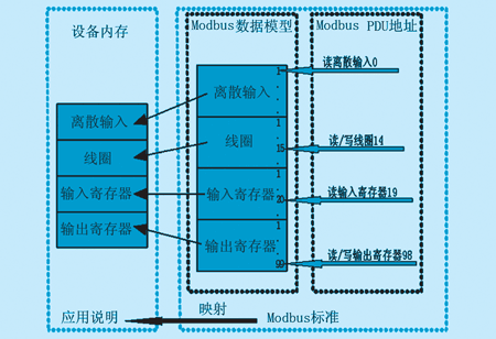 PDU的寻址方式也在Modbus应用层协议中作出了具体的定义。在Modbus PDU中每一个数据都赋予从0~65535中的一个值作为该数据的地址。而在Modbus数据模型中,每一种数据类型块中的数据单元都定义了一个从1到n(设备容量决定)的值作为其地址。Modbus数据模型要与符合IEC-61131标准的实际设备内存或者其他模型对应起来,这方面的映射关系是由设备生产厂家制定的。图二给出了Modbus寻址模型,设备内存中的四种数据模式的组织方式是由厂家决定的。由图2可知,一个Modbus PDU地址所对应的Modbus数据模型地址为该PDU地址加1。