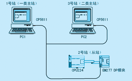 (1) 硬件:带Siemens CP5611卡的PC机两台,一台配置为一类主站,另一台配置为二类主站;从站为Siemens S7-200 系列PLC的CPU224一块,带Siemens EM277DP通讯模块;三个网络连接器;连接线为双绞线。